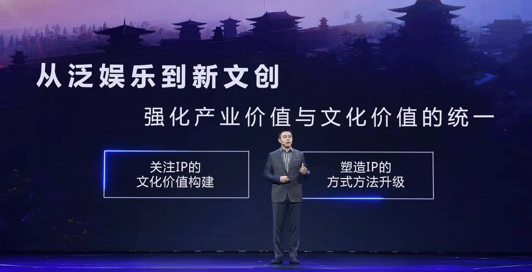 腾讯新文创的提出者正是程武,也是其“泛娱乐”理念的升级,其核心是一种以IP构建为核心的文化生产方式,通过强化文化价值与产业价值的互相赋能,最终打造出更多属于中国的文化符号。