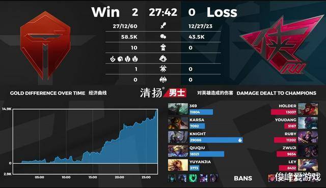 在TES战队与RW战队的首局比赛中,TES战队Pick:剑魔、盲僧、卡萨丁、女枪、锤石,RW战队Pick:奥恩、巨魔、沙皇、厄斐琉斯、巴德,在比赛前期,TES战队也是以发育为主,并且,TES战队占据经济的领先,比赛来到20分钟,RW战队开始发力,不但拿下大龙,还不断取得团战胜利,处于经济的领先,然而,随着比赛的进行,Knight的卡萨丁发育成型,RW战队两次试图一波结束比赛,但是,Knight使用卡萨丁一波四杀,TES战队绝地翻盘,艰险赢下了首局比赛。