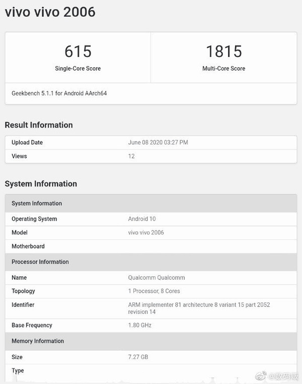 从该跑分网站上可以看到,vivo X60s手机的型号为vivo 2006,其单核跑分为615分,多核跑分为1815分。vivo X60s搭载了高通骁龙765移动平台,支持5G网络,运存为8GB,运行Android 10系统。该跑分网站仅公布了这款手机的部分参数信息,因此我们暂时不知道该机的外观信息和上市日期。另外,有消息指出,vivo X60s是一款面向海外市场的产品。