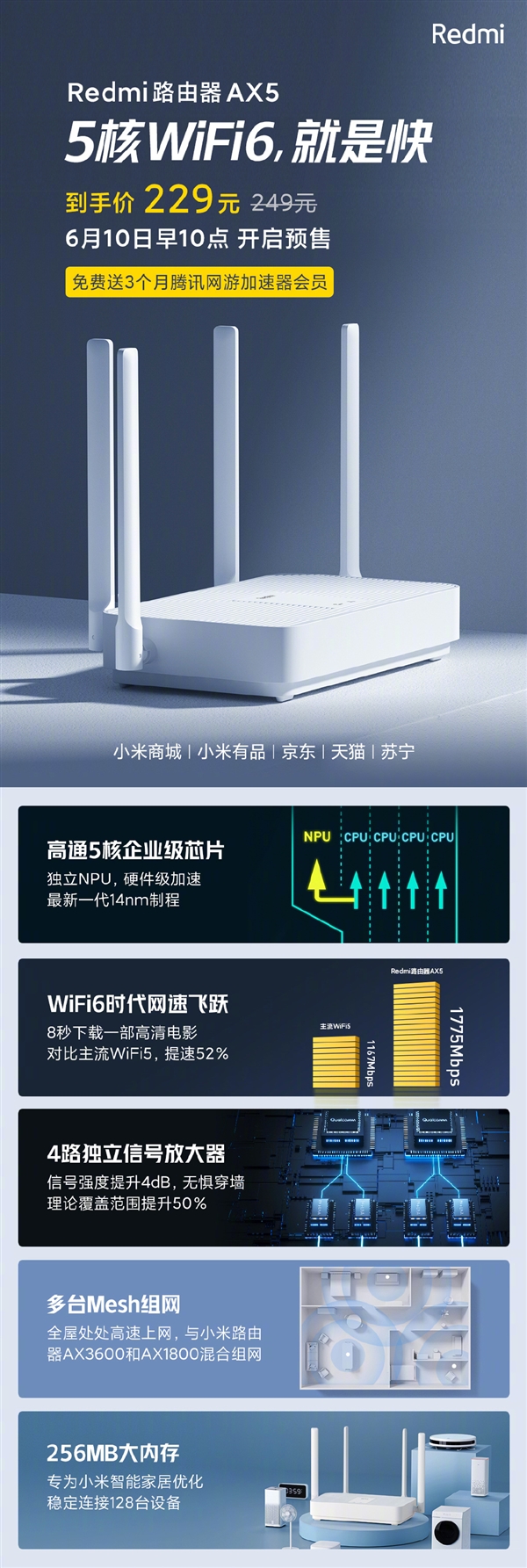6月10日消息,Redmi首款WiFi 6路由器AX5将于今天10点开启预售,首销免费赠送3个月腾讯网游加速器会员,到手价为229元。