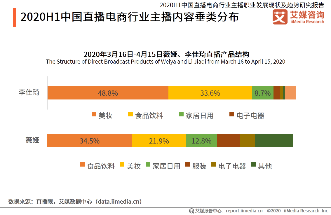 2020年3月16日至2020年4月15日期间,从李佳琦与薇娅淘宝直播带货产品结构来看,其化妆品品类商品占比分别为48.8%和21.9%;食品类分别占到33.6%和34.5%。艾媒咨询研究发现,综合能力较强的主播带货的品类比较丰富,除了主播个人鲜明的标签品类商品,其他品类的货物也卖的比较好。