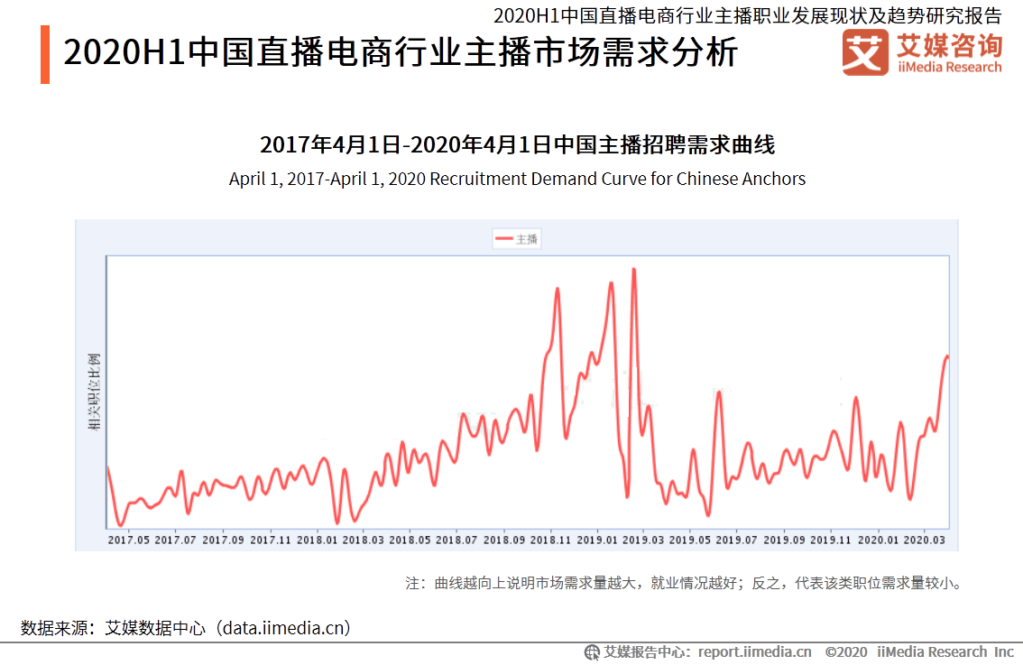 2018年Q4至2019年Q1,中国主播岗位需求激增,曾出现3次峰值;2019年6-7月开始,主播市场需求呈现波动上升趋势,到2020年3月,主播市场需求持续上升,未到达峰值点。艾媒咨询分析师认为,中国直播电商的火爆发展,更多企业与品牌会入局,这就直接推动了主播岗位市场需求的增长。