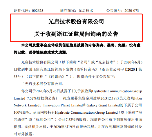 6月5日,浙江证监局也下发了监管问询函。浙江证监局首先要求光启技术说明本次收购接洽商谈至最终确定的过程,包括但不限于具体时间、涉及人员、具体事项,签订协议和聘请中介机构时间、具体尽调和评估进展情况。