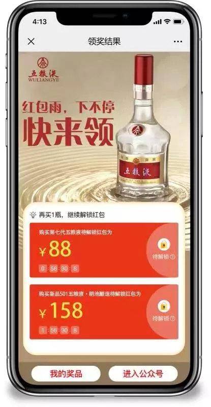 ①借助“待解锁红包”吸引消费者复购。比如,五粮液在广州某指定烟酒店做一店一码促销活动,消费者购买五粮液指定产品,扫码即可参加“购买五粮液,瓜分1亿元现金”的活动,扫码不仅能获得现金红包,而且也能获得待解锁红包,再购买一瓶五粮液指定产品即可解锁,以此吸引消费者不断复购。