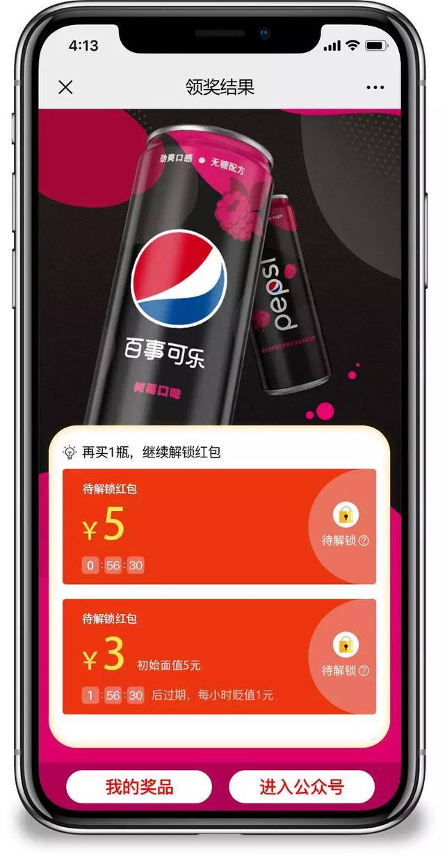 ②基于“待解锁红包”具备按小时递减红包金额的有效性。比如可口可乐今年新推出的无糖树莓口味,在指定士多店做一店一码活动,当消费者刚领取到“待解锁红包”的1个小时内购买产品并扫码,即可解锁获得5元现金红包;之后每隔小时递减2元。通过制造“急迫”的营销氛围,消费者“害怕失去优惠”的心理,提高消费者对新品的购买欲望,也缓解了以往消费者进店后,只逛不买的压力。