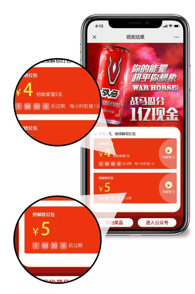 ③利用“待解锁红包”的提醒功能。比如红牛一直在大力推广的产品——“战马”,在指定夫妻店做一店一码活动。当消费者扫码之后获得“待解锁红包”5元,由于特殊情况没有在门店购买交易,但这并不会导致给客户的流失,因为“待解锁红包”的提醒功能,时刻提醒着消费者红包的有效时间,不断提高消费者主动到店购买的欲望,从提升产品的有效转化。