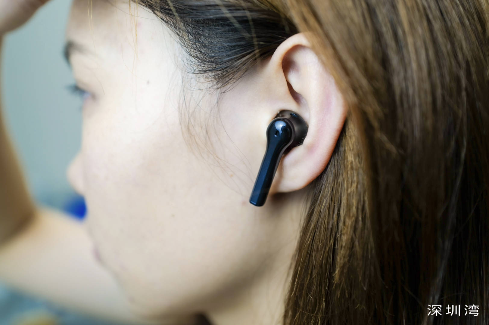 耳机依然采用的是与 AirPods 类似的半入耳式设计,与充电盒一脉相承的黑蓝渐变色、镜面效果、圆润。佩戴上,对于很多不习惯密闭耳压的人来说,这种半开放式的挂耳效果是最合适不过了,并且,vivo TWS Neo 的耳机柄也要比 AirPods 等大多数 TWS 耳机要短。