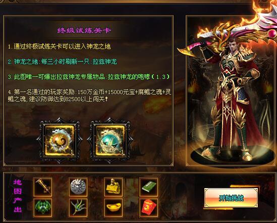 独家特色关卡:试炼之地挑战独家特色关卡分为三个级别,初级,高级,终极挑战,成功挑战关卡后,可以分别进入各个难度的试炼之地,试炼之地有专属BOSS,可以爆出专属物品。并且前几名成功挑战的玩家可以额外获得奖励。