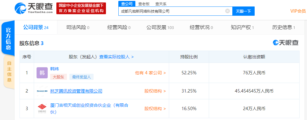 天眼查数据显示,该公司工商披露的股东中,韩炜为第一大股东,持股比例为52.25%,林芝腾讯投资管理有限公司为第二大股东,持股比例为31.25%,吉相资本为第三大股东,持股比例为16.50%。