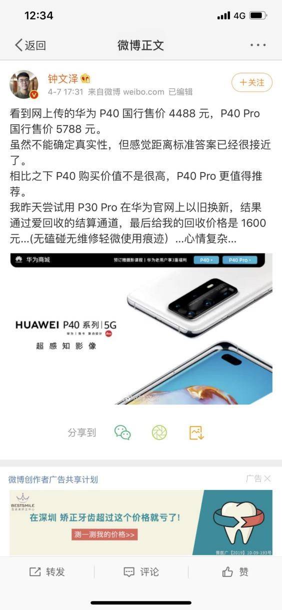 其实,在今年4月华为P40发布后,数码博主钟文泽就在微博中吐槽华为商城爱回收的以旧换新服务: