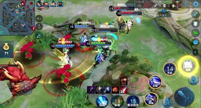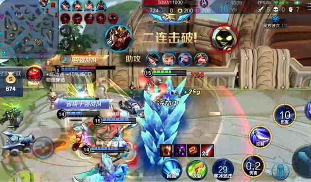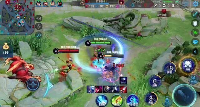 由于对面的三国服阵容也不是非常的肉,所以这里孙膑即使没有搭配肉坦也关系不大。而且关羽的支援能力也非常强,可以在前期就打出很好的效果。所以利用好这个优势,开局两分钟兰陵王就和关羽入侵对方红野区并拿下双人头。