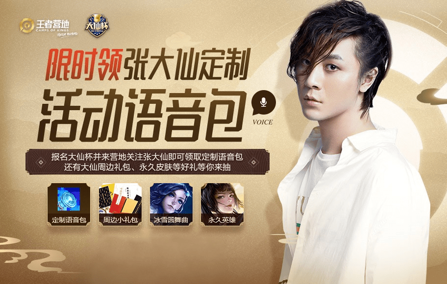 在游戏内报名大仙杯微赛事并在王者营地关注张大仙,即可领取张大仙定制活动语音包。语音内容有:冰心一出,游戏结束。MVP理所当然。