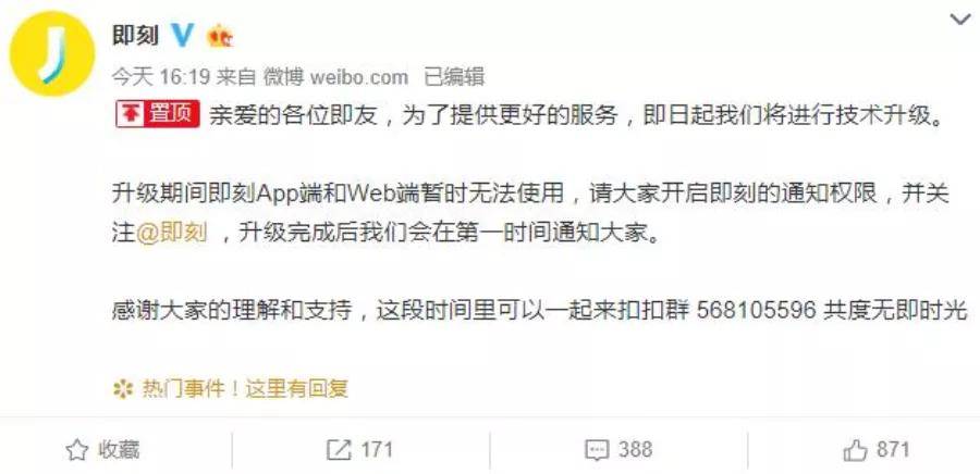 2019年7月12日,即刻团队发布公告称,“即刻将进行技术升级,升级期间即刻App端和Web端暂时无法使用。”