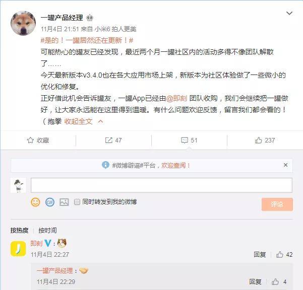 2019年11月4日晚,@一罐产品经理 微博用户发文称“一罐已被即刻收购”,随后“即刻”官方微博在评论区以握手表情回复,承认了该消息。7月份时“一罐”曾被传关停,创始人纯银(郭子威)还在微博上就关停发布了产品复盘。