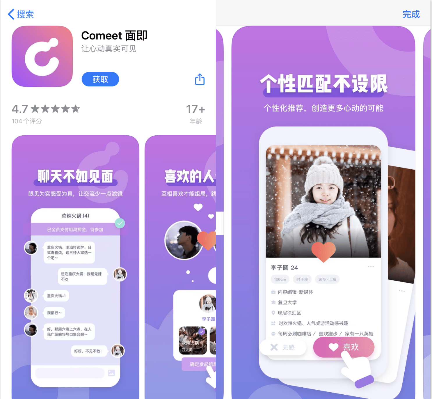 • 3月29日,即刻推出一款名为“Comeet”的社交App产品,旨在让城市青年线下组局交友、拓展人脉圈子、创造恋爱机会。