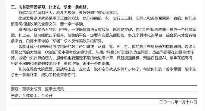 观察者网注意到,2019年1月18日,任正非在杭州研究所业务汇报上发言。他提到,“谷歌军团的编制不大,战斗力极强,要好好向谷歌军团学习。终端发展迅速就是采用了正确的方法,他们搞四组一队,实行三三制,实际上和谷歌军团是一致的。算法团队直接杀入到项目中去,一线既有算法又有数据,就容易突破。你们组织优秀的博士形成一个谷歌军团,扑上去,就可能把口子撕开。”