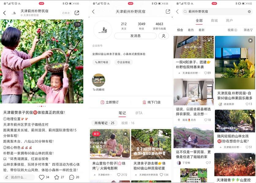 开通小红书企业号一个多月来,天津蓟州朴野民宿从小红书渠道获得的订单占比超过30%。民宿主“九月”介绍,5月份民宿基本满房,通过在小红书更新民宿和周边的乡村生活的内容,吸引到了非常精准的客群。