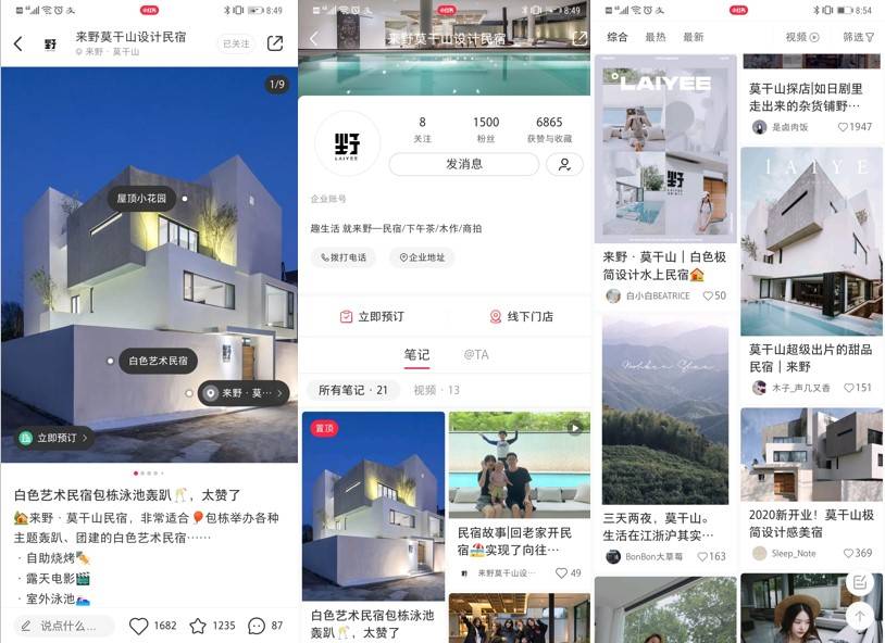 民宿主“老胡”介绍,来野是今年刚刚开业的民宿,希望能尽快在竞争激烈的莫干山民宿群中打出差异化和品牌。来野企业号打造的美宿、美食、美物系列,许多内容无法在OTA平台呈现,但这些正构成了来野的与众不同。“小红书对新民宿打品牌帮助很大。”