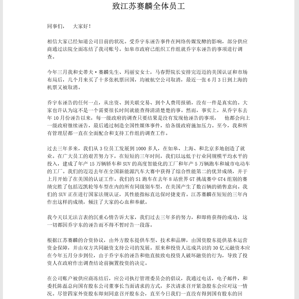 6月9日,王晓麟致全体员工的一封内部信在网络流传。信中称,受乔宇东诬告事件影响,部分供应商通过法院全面冻结了赛麟汽车账号,如皋市政府已组织工作组就此事进行调查。
