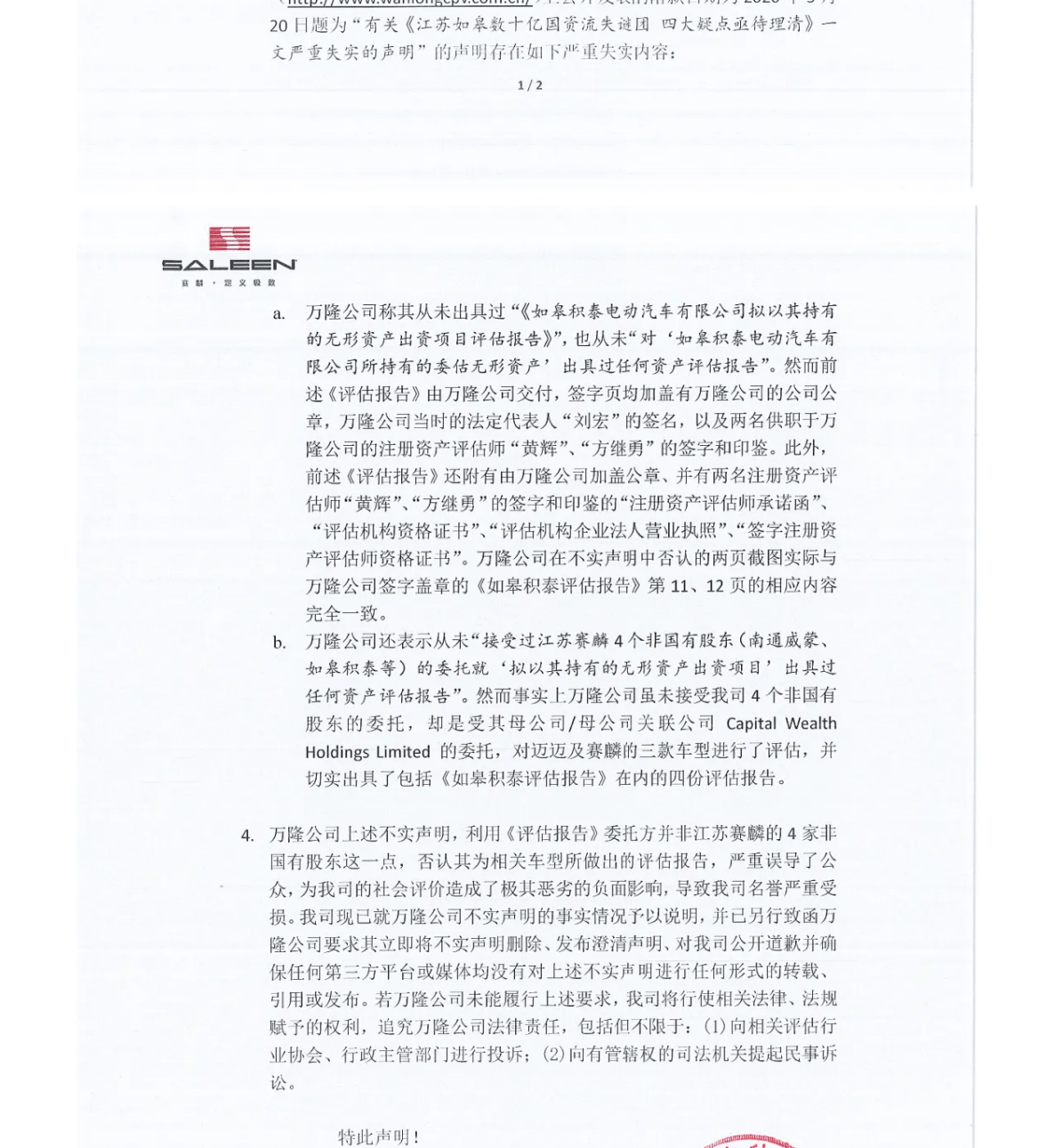 不过,随着舆论风波发酵,万隆发声明称从未出具过《如皋积泰拟以其持有的无形资产出资项目评估报告》,也从未对“如皋积泰所持有的委估无形资产”出具过任何资产评估报告,且从未接受过赛麟汽车4个非国有股东的委托就“拟以其持有的无形资产出资项目”出具过任何资产评估报告。