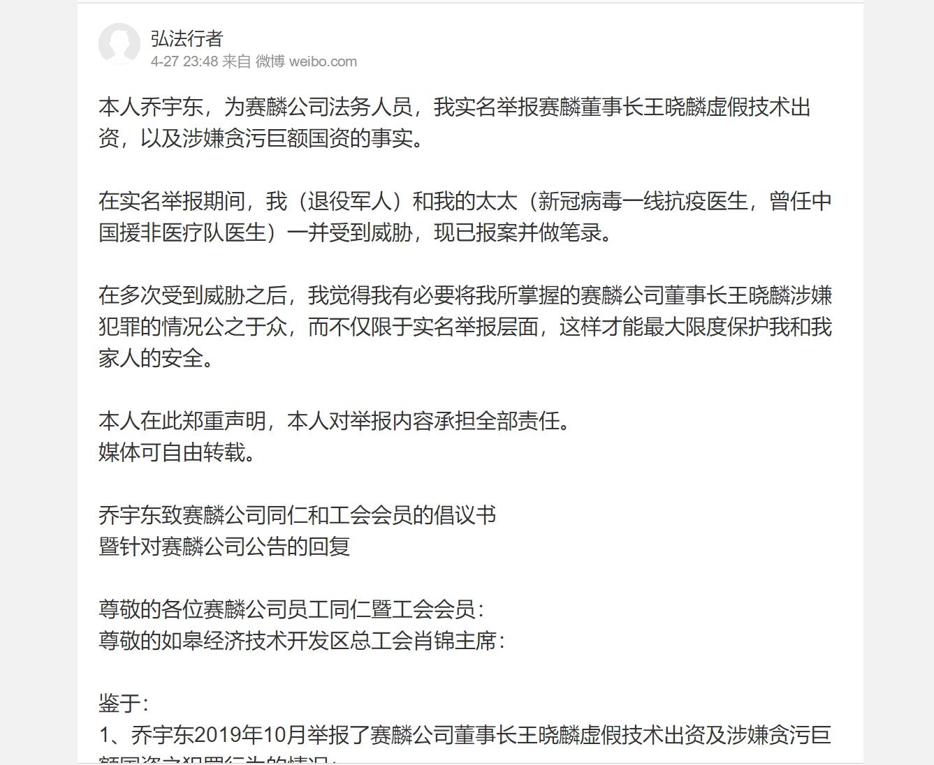 4月27日,江苏赛麟汽车科技有限公司(即赛麟汽车)前法务高级经理乔宇东在网络发布实名举报信,称董事长王晓麟涉嫌虚假技术出资、贪污巨额国资,将成本价50万美元和2000万美元的技术分别作价55亿元和11亿元入股,导致数十亿元国资流失。