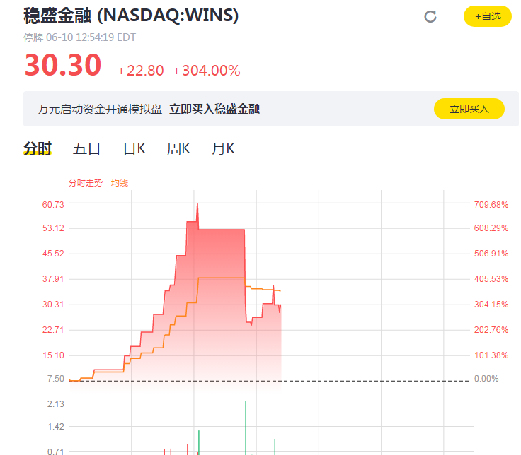 另外一只金融类中概股,稳盛金融,也暴涨超600%触发熔断,股价从8美元暴涨至55美元每股。不过截至发稿,仍大涨304%。资料显示,稳盛金融控股集团是一家领先的综合贷款解决方案提供商,主要服务于中国晋中市和中国北京的中小型企业(SME)。公司目前提供两个金融产品和一个补充服务:财务担保,融资租赁(或资本租赁),融资咨询。