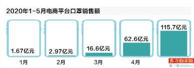 3月起,缺货与限售等情况缓解,口罩销售额从3月的16.6亿元,攀升至4月的62.6亿元、5月的115.7亿元。从增长速度来看,口罩3月的交易额增长近460%,随着4月、5月供给稳定,电商口罩的销售额仍在增长,但增长率逐渐下降、趋稳。