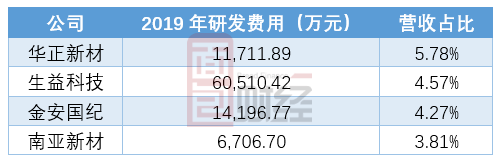 不过,与同行业上市公司相比,公司研发投入金额及占比均较低。以2019年为例,华正新材、生益科技、金安国纪研发费用分别为1.17亿元、6.05亿元及1.42亿元,研发占比分别为5.78%、4.57%及4.27%,均要明显高于南亚新材。