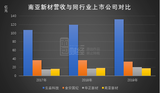 2019年,南亚新材营收17.58亿元,同比微降4.34%。同行业公司中,金安国纪2019年营收出现下滑,同比减少9.8%;华正新材及生益科技2019年营收保持增长,同比增幅分别为18.19%及10.52%。以2019年营收计,华正新材赶超南亚新材成内资厂第三名。