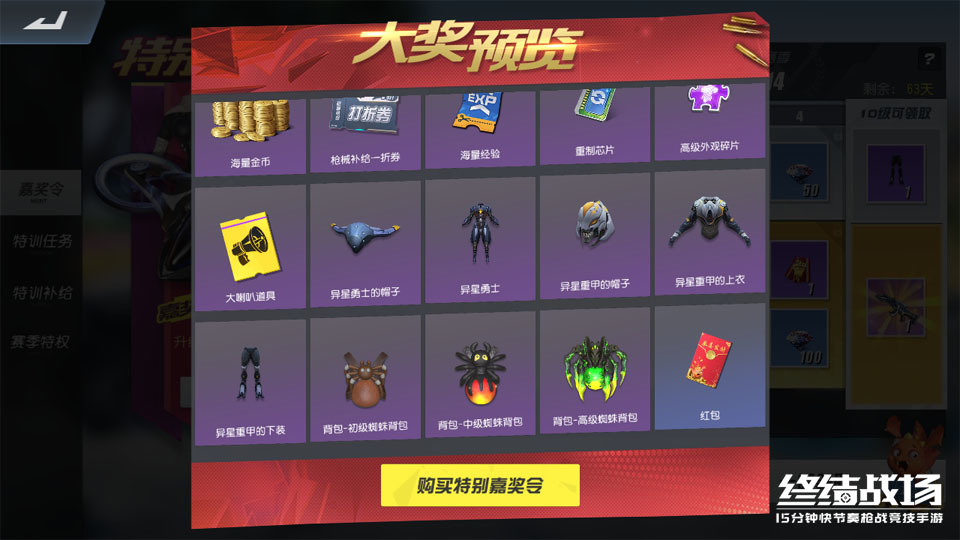 随着S14赛季的到来,嘉奖令奖励将再次迎来全面升级,大量精美外观加盟奖励礼包,掀起战场时尚风暴。其中普通嘉奖令中包含“异星重甲”、“中级蜘蛛背包”、“异星勇士”等奖励物品,升级特别嘉奖令后,还可获得以“女骑士-红”为代表的骑士系列人物外观,晶耀AKM外观以及翼装螺旋伞面皮肤等奖励,玩家在游戏中获得特训积分后即可兑换对应的奖励物品。
