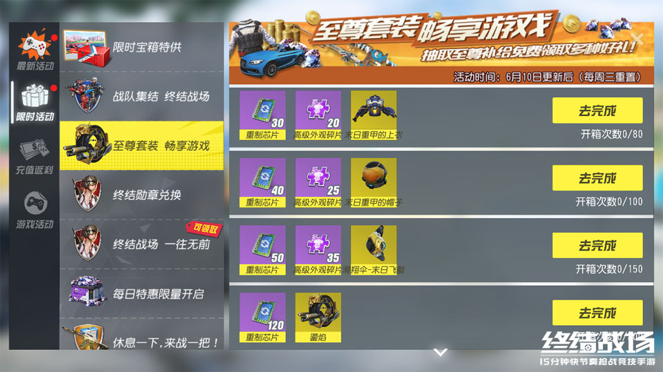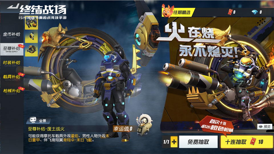 在同步更新的抽至尊补给限时活动中,玩家抽取至尊补给达到一定次数,即可兑换包括“废土战火”在内的各种外观以及其他游戏道具奖励。