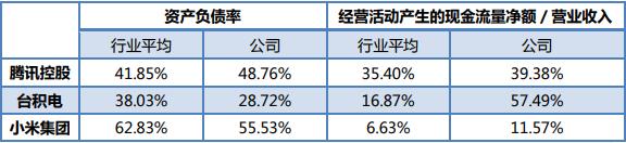 观察三家公司的资产负债率发现,截至2019年12月31日,台积电、小米集团的负债在总资产中的占比低于行业均值,仅腾讯控股的这一指标较行业均值高。三家公司的经营活动现金流量表现均优于行业平均水平。