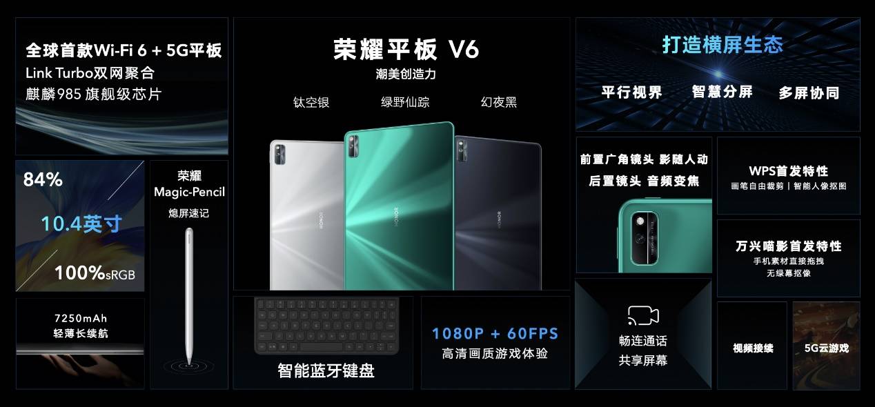 从硬件方面来讲,荣耀平板V6是全球首款同时支持5G和Wi-Fi 6的平板电脑。无论出门在外还是在室内或者高铁等移动办公等场景,用户可以实现随时随地上网,从网络上解放了平板的创造力;麒麟985旗舰级芯片的使用,则提升了荣耀平板V6的整体性能,各项表现更加卓越。