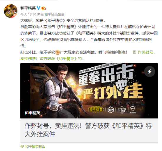 据《和平精英》官方微博,昆山警方成功破获了《和平精英》“鸡腿挂”案件,已全面摧毁该外挂在中国地区的销售网络。