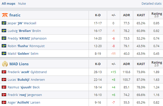 双方首图来到MAD Lions选择的Nuke,先执进攻方的丹麦人似乎是继承了Astralis丢失的Nuke特性,在acoR疯狂的进攻狙的突破下,MAD Lions轻松在上半场拿下6-0开局。尽管随后为JW起到狙击的fnatic凭借残局的出色发挥终于获得艰难四分,但随后MAD Lions疯狂的快攻又将fnatic的防线摧毁。上半场仅取4分的fnatic在进攻方也根本不是MAD Lions的对手,图一丹麦人轻松以16-7拿下。