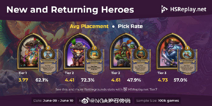 炉石酒馆战棋新版本首日四位海盗英雄的平均名次与出现后的选取率,分段为7200以上,数据来源HSReplay。