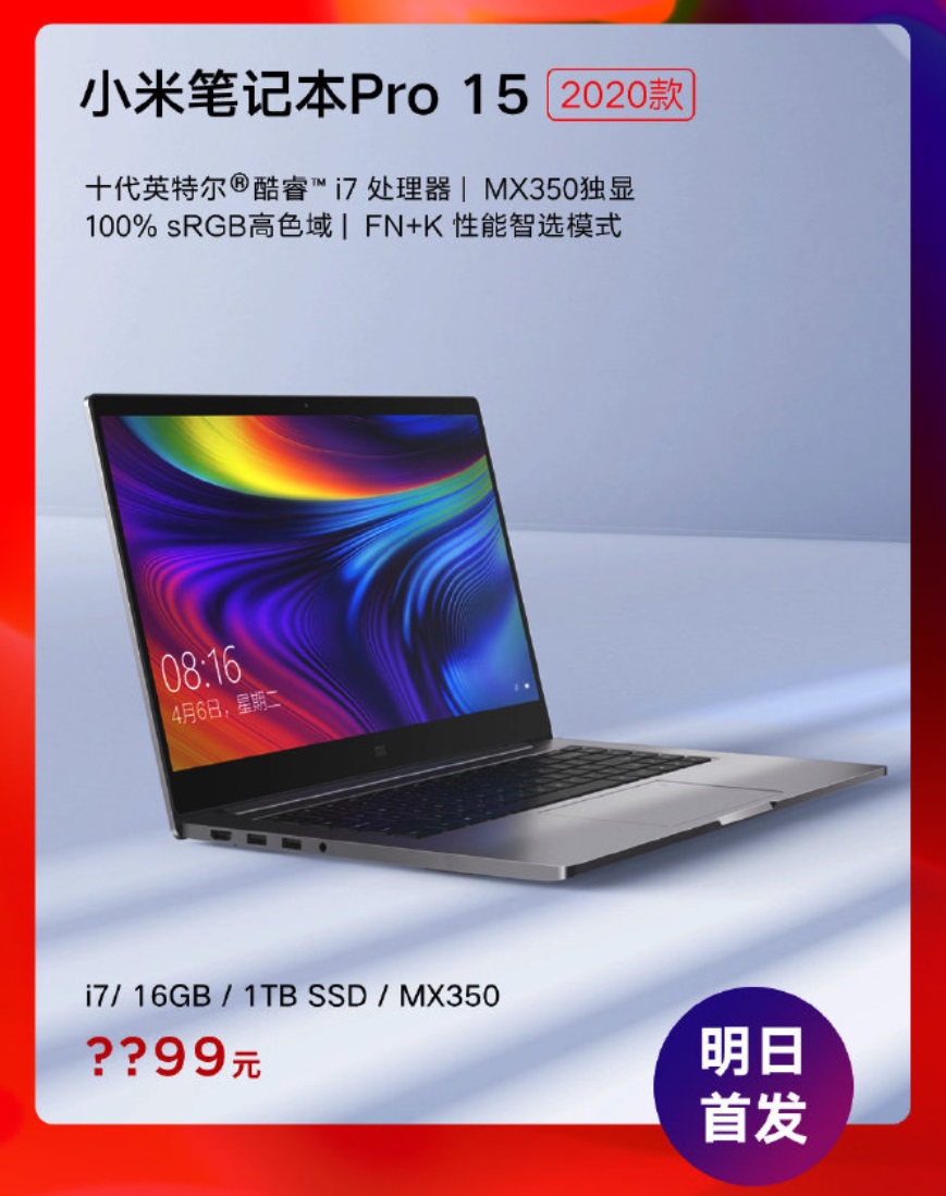 小米笔记本 Pro 15 2020 款将于明日首发,现在官方已经公布了配置:十代 i7+MX 350。