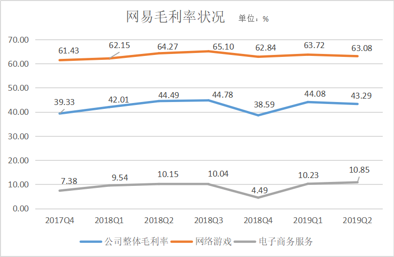 虽然电子商务占有的比例不低,但毛利率维持在10%左右,这与游戏业务动辄60%以上的毛利率相距甚远。2019年Q2电商业务的增速进一步放缓,同比增长20.2%,与高峰时期近200%的增长相比,缩水到仅十分之一。