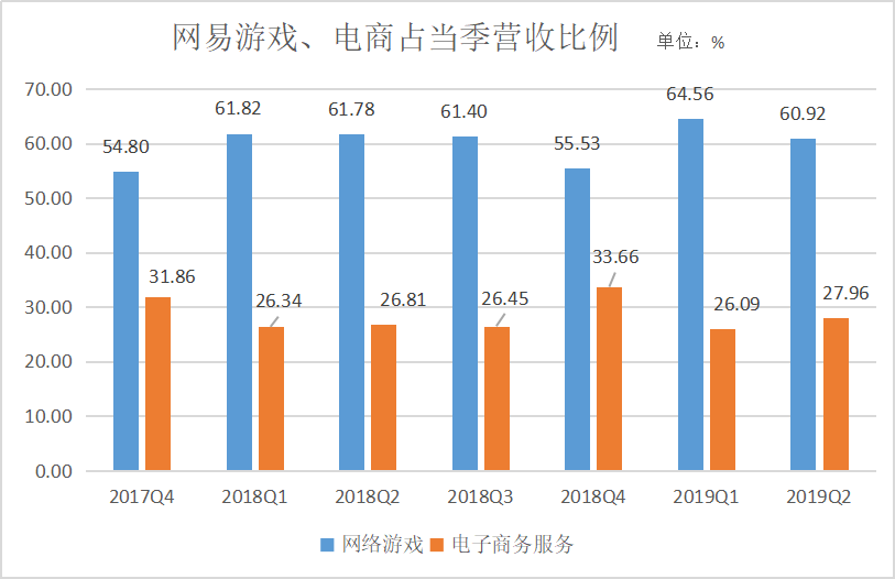 近年来,网络游戏占网易营收的比例从未低于50%。2017年Q4~2019Q2,网络游戏板块占公司当季的营业收入比例分别为54.80%、61.82%、61.78%、61.40%、55.53%、64.56%、60.92%、78.81%、73.75%、79.23%。