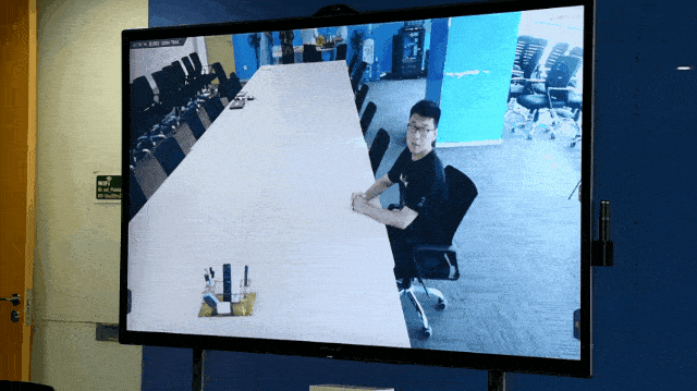 更令合作伙伴惊奇的是,MAXHUB V5 科技版会议平板还支持声源定位。我们这边不管哪位同事发言,画面总会自动对准他,并且自动放大人脸。这种方式的好处是可以让对方始终明确是谁在发言,就好像大家坐在同一间会议室只是变换目光一样。