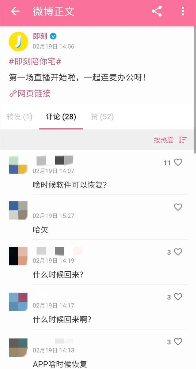 大家都以为微博也要停更了,结果官方微博每天跟个没事儿人一样正常更新,于是大家就每天都跑到官微下面催更,即使到了疫情期间,即刻官微每条微博还是有几十条催促的评论。。。