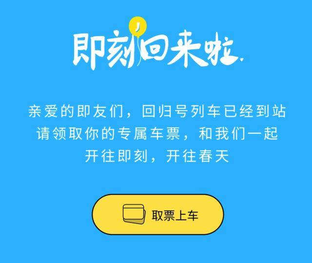 即刻官方很隆重地搞了个 H5 动画,并以 “ 回归 ” 为主题,以 “ 太阳即刻升起 ” 为口号,并为用户生成一张骚黄色的车票,老用户很难抗拒这样的情怀,纷纷把自己的车票分享到了朋友圈。