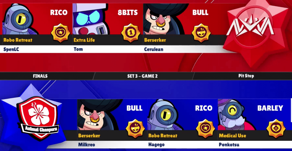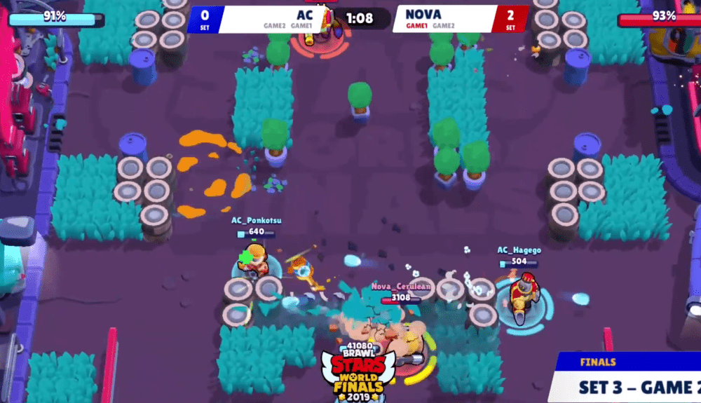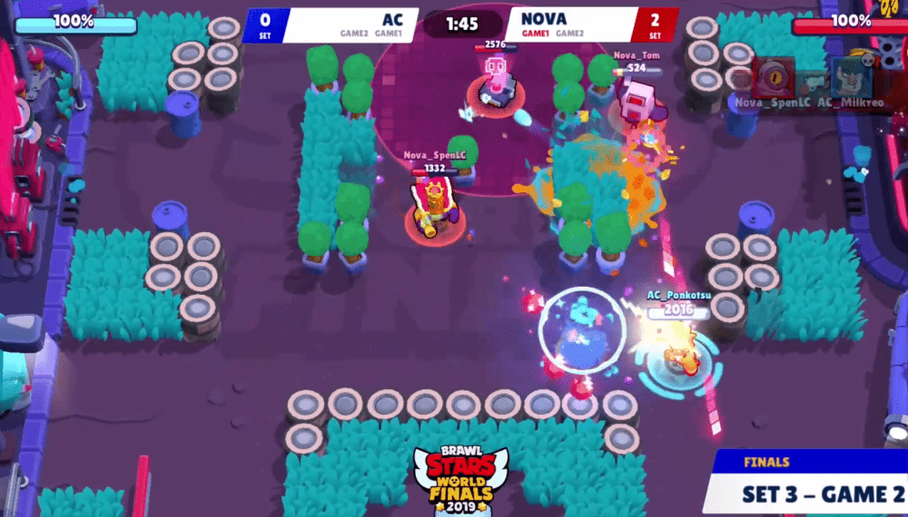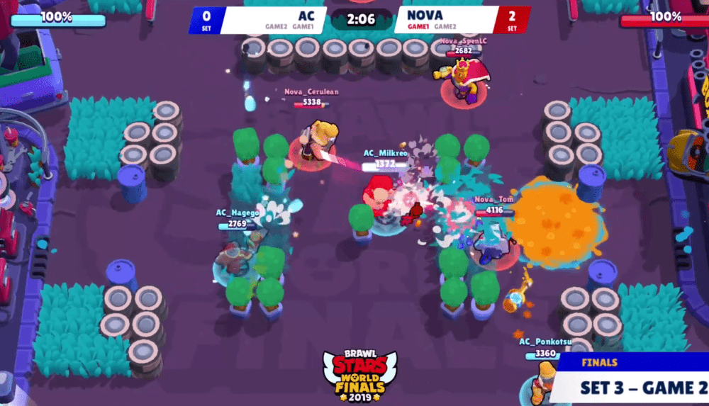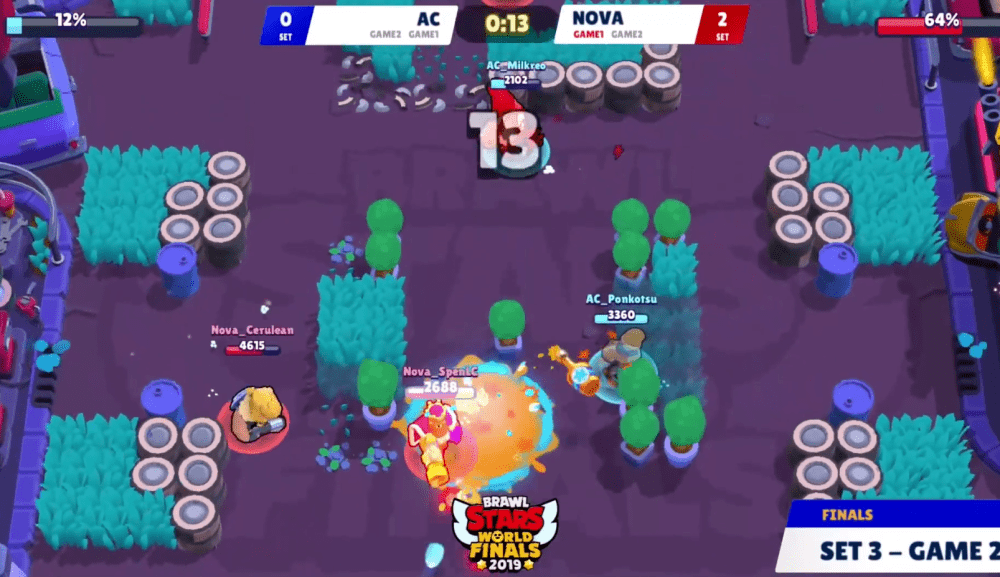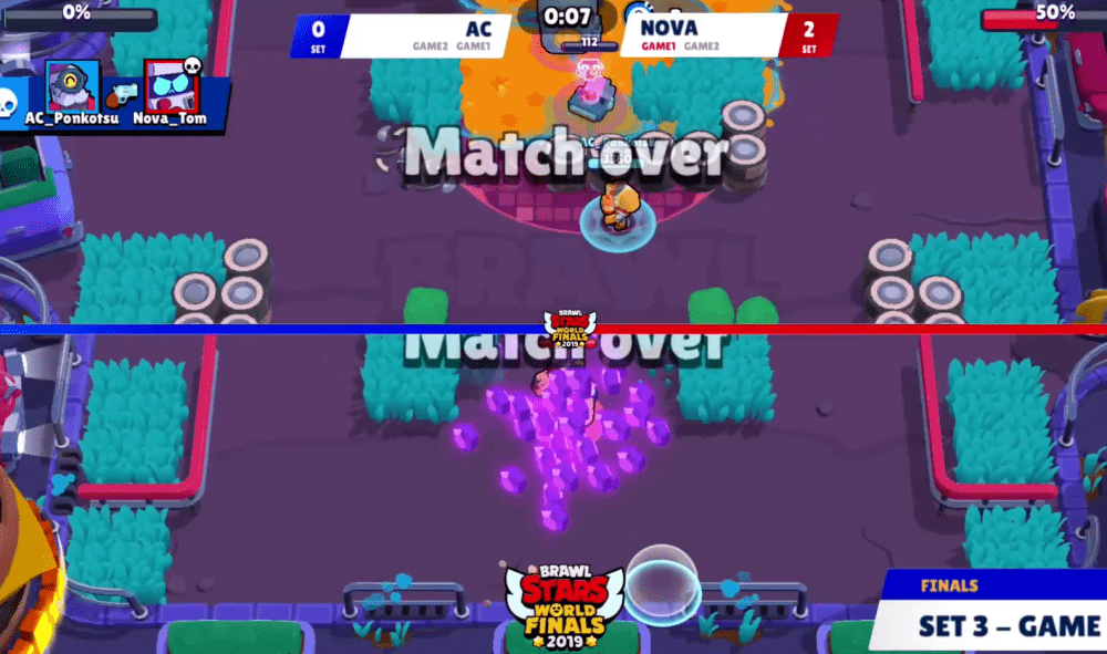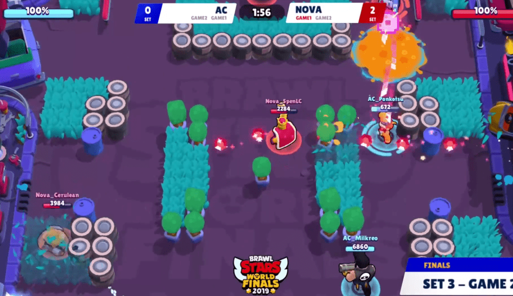 荒野乱斗传奇锦标赛,决赛的比赛中,AC战队对战NOVA战队,双方的最后一场比赛是金库攻防战,开局双方都非常的保守,在地图中间不断的友好试探,企图抓到对方的走位漏洞,让对方减员,从而逐步扩大优势。