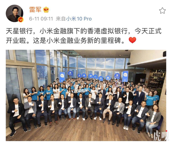 6月11日下午消息,小米董事长兼CEO雷军今日在微博上透露,小米金融旗下的香港虚拟银行,天星银行今日正式开业。