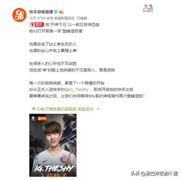 以前IG强的时候,theshy强的时候,几乎看不到他们直播的身影,但自从IG高调进入虎牙直播,打完表演赛,TheShy被bug单杀之后,IG和TheShy便开始一蹶不振。现在夏季赛IG即将首秀之际,IG却官宣the shy选手正式进驻快手短视频。