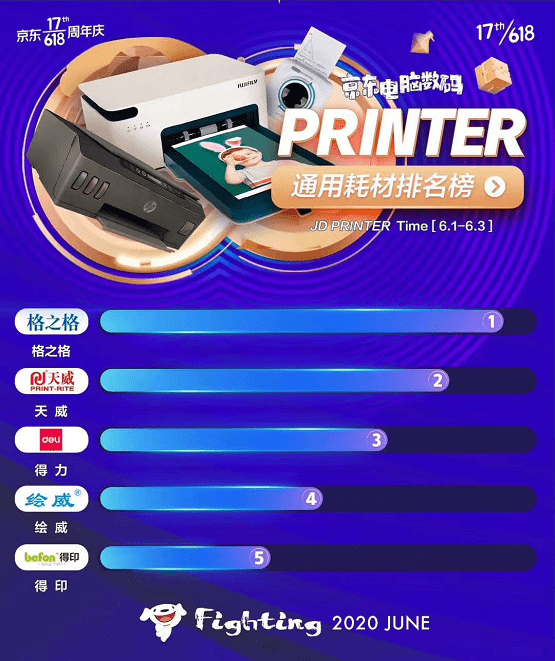 此外,格之格限量礼盒也是献给格之格诞生二十周年的礼物,颇有纪念意义。在京东平台公布的618购物节首日办公打印排行榜数据中,前九名中兼容耗材品牌占据六个席位。其中,格之格位列京东耗材产品硒鼓/墨盒销售额第一名,获得消费者广泛认可,喜迎618“开门红”。