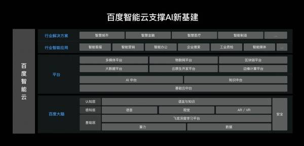 6月11日,百度AI新基建版图亮相。百度正在依托包括百度大脑、飞桨、智能云、芯片、数据中心等在内的新型AI技术基础设施,推动智能交通、智慧城市、智慧金融、智慧能源、智慧医疗、工业互联网和智能制造等领域实现产业智能化升级,目标为中国新基建AI服务最大提供商。