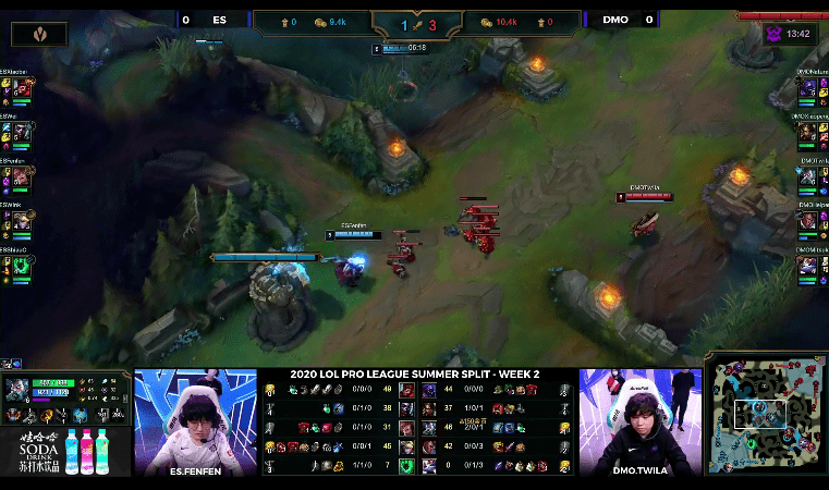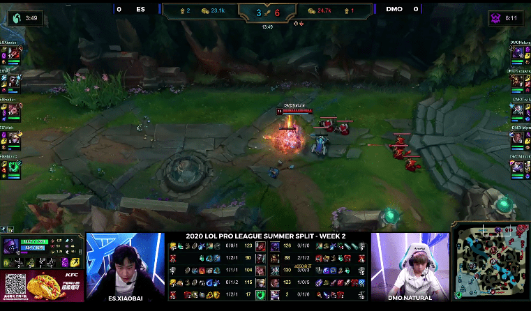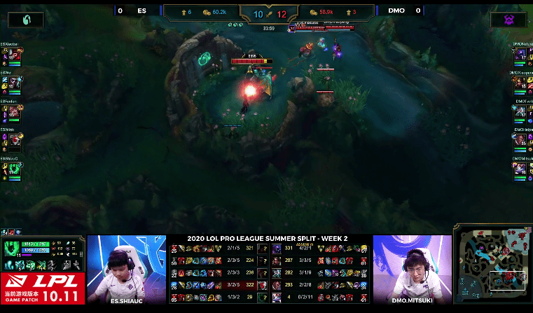 [03:49] 双方在下半河道发生碰撞,DMO来回拉扯,基兰一个平A拿下丝血的艾克。之后,基兰炸弹炸死瑟提,锤石也是无法逃脱,被DMO集火击杀掉,ES一口气交代三人。接着,锤石在下路钩到悠米,交出点火和余震触发,EZ跟上伤害,将其收下。