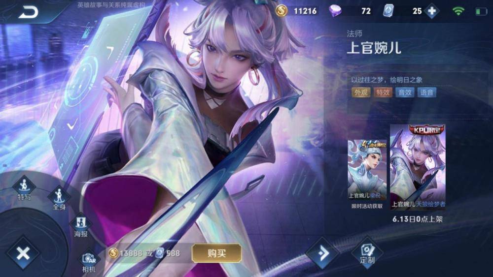 自从官方宣布天狼星系列的最后一款皮肤是上官婉儿,想必很多玩家都在等着这款KPL限定皮肤上架了。如今这款皮肤已经确定上架时间了,那就是在6月13日0点开始上架,一直到7月31号12点之前结束。很多玩家也都拿到了这款皮肤的体验卡,这皮肤还没上架呢,我就在排位中看到不少人用了,也有不少玩家纷纷计算怎么购入才能够最划算,可我觉得这款KPL皮肤真的那么值得吗?