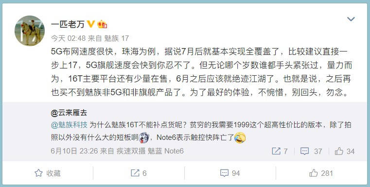 而魅族科技营销负责人万志强也在回应网友关于 4G 老机型 16T 是否补货的问题时表示,5G 布网速度很快,建议一步到位买 5G 旗舰,16T 将在 6 月以后“绝迹江湖”,并且之后将再也买不到魅族的非 5G 及非旗舰产品。